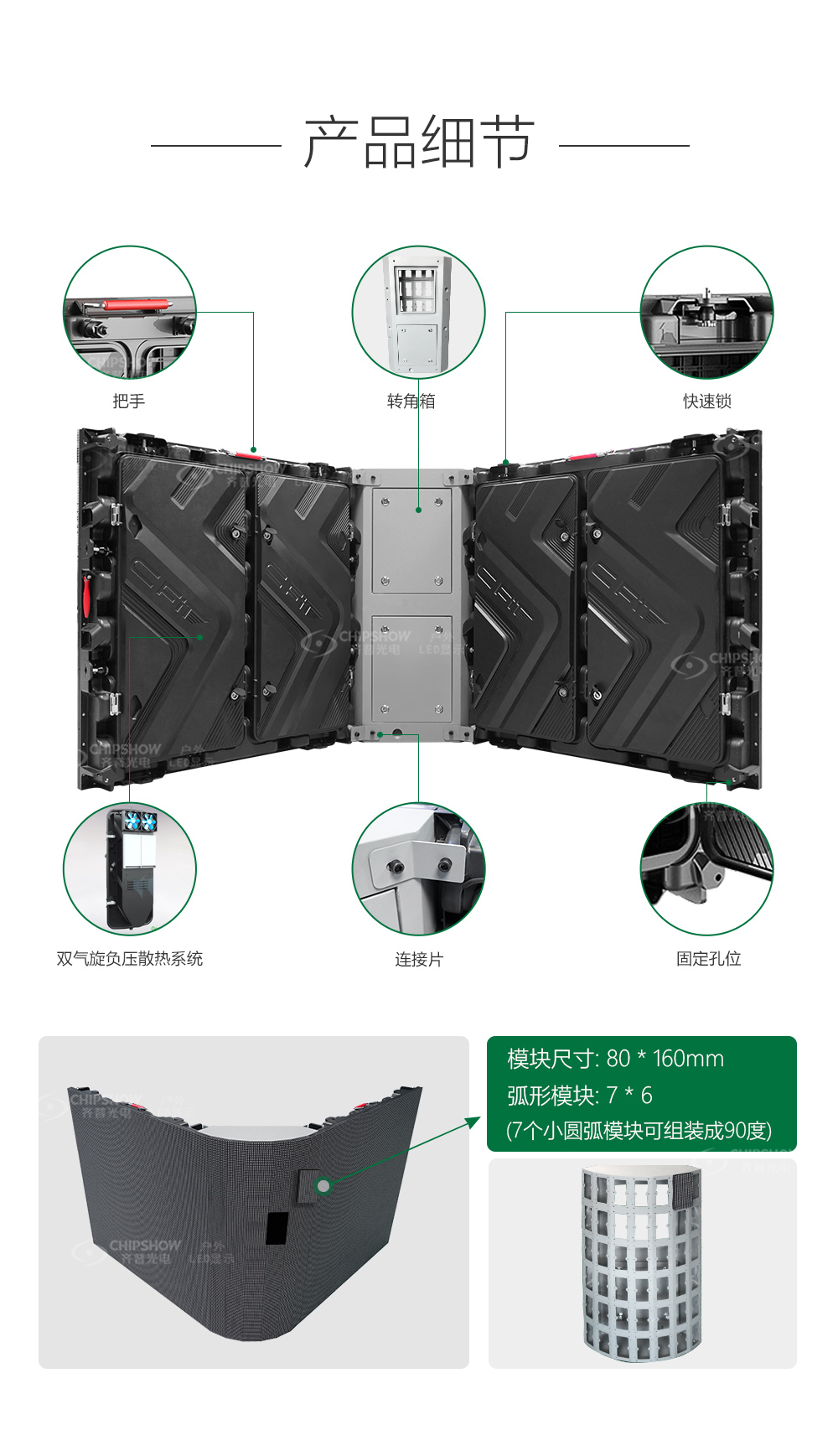 9. 弧形转角部分15vip太阳成开了一个特殊弧形模组,弧形转角箱体用钣金做,两直边用15vip太阳成的  C-Fit P6.667  960X960压铸箱体做。
