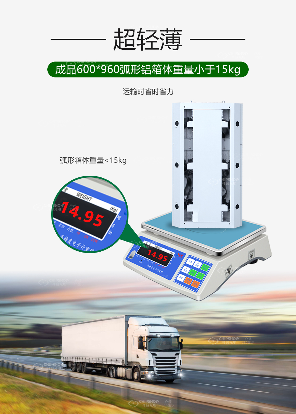 5.超轻:成品600X960弧形铝箱体重显量小于15kg/pcs(25kg/m²),运输省时省力;