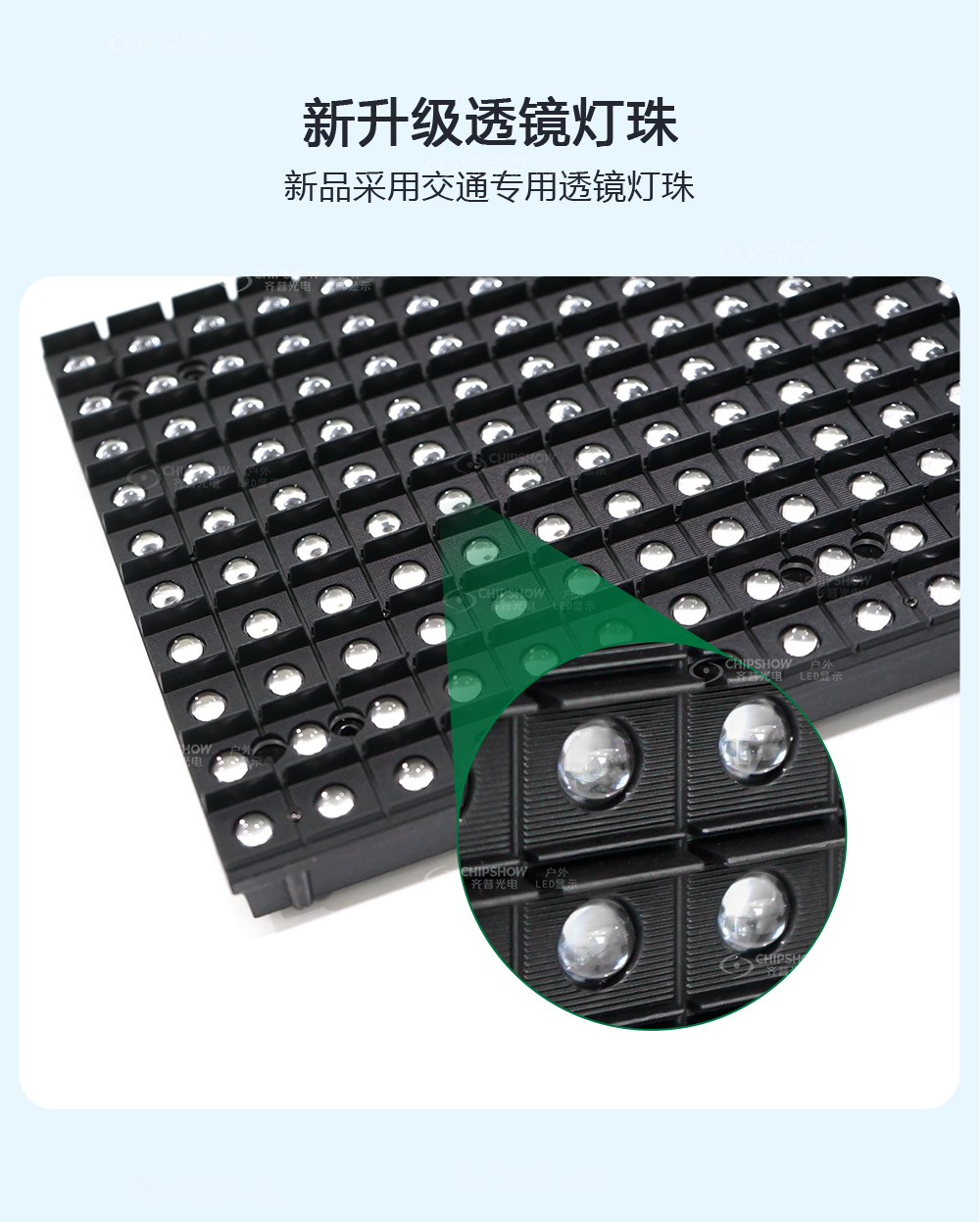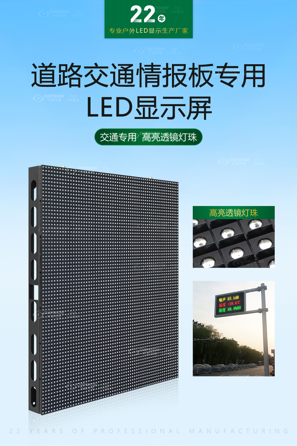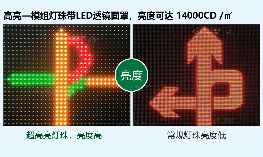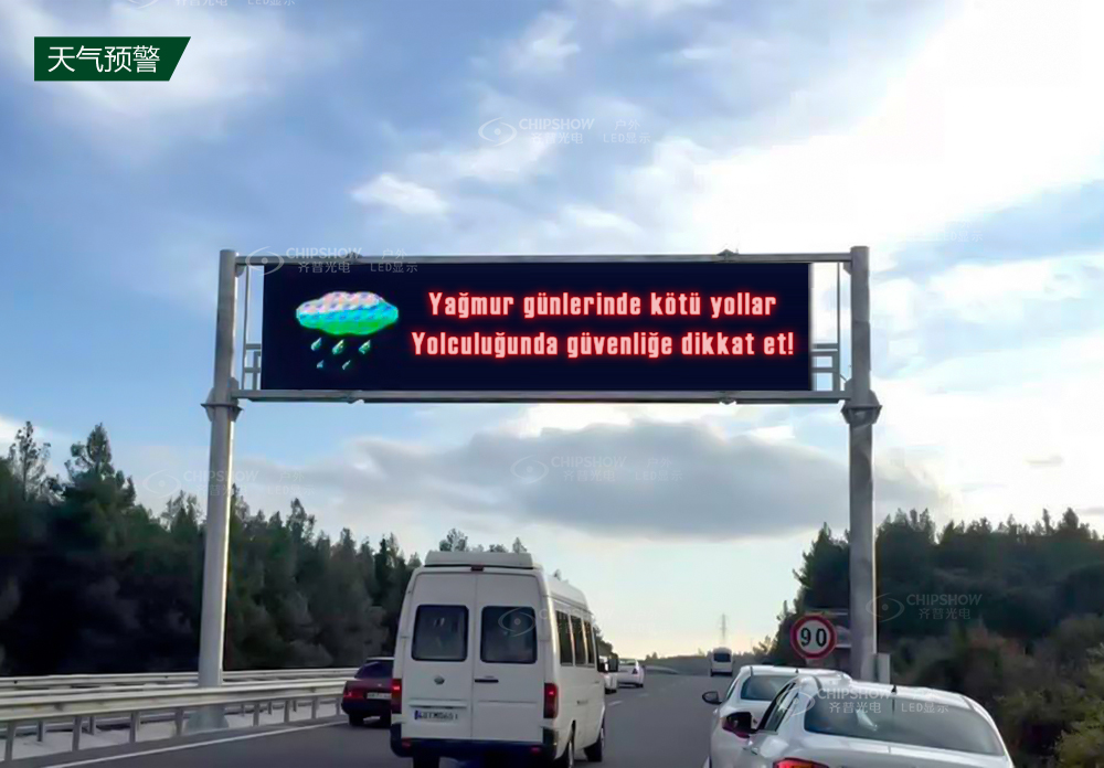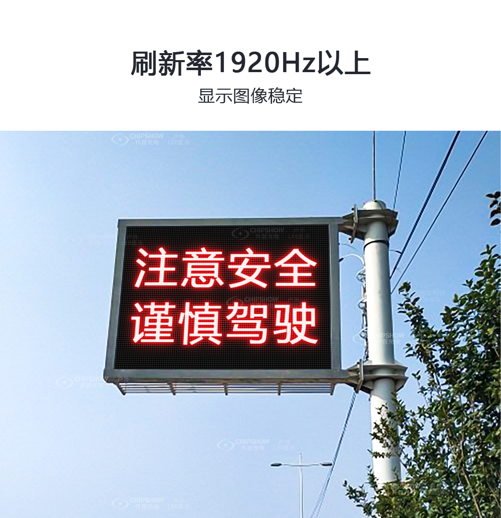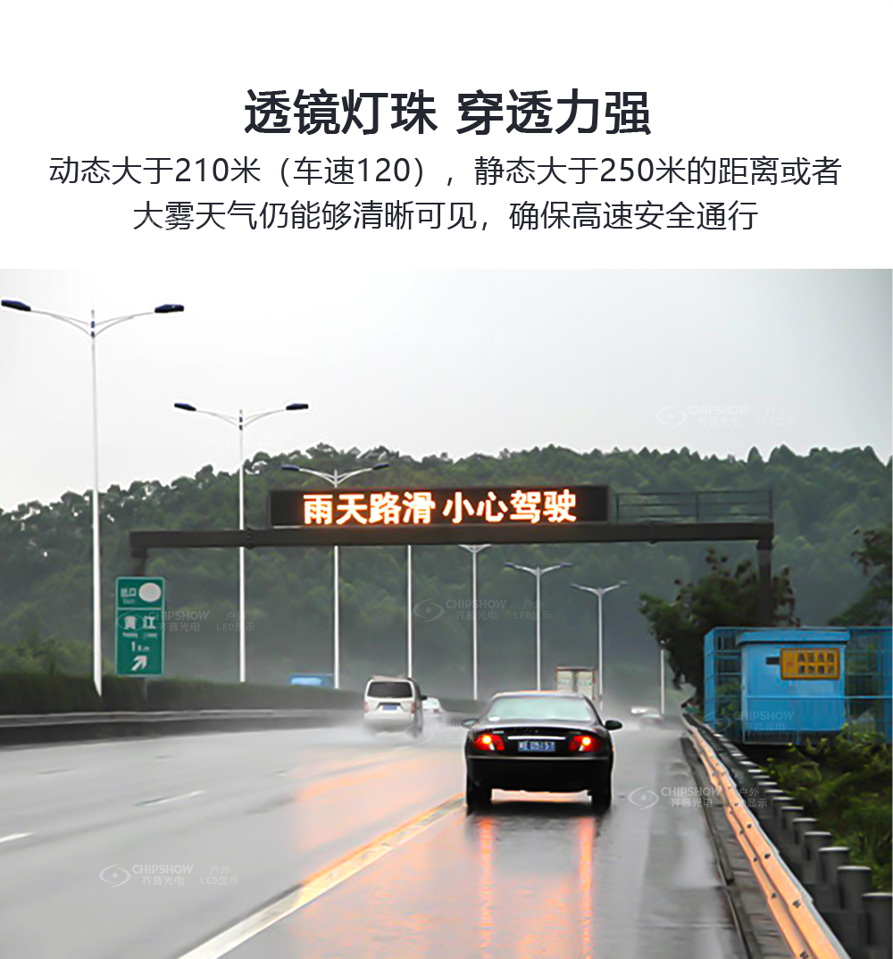 高亮-模组灯珠带LED透镜面罩,亮度可达14000CD/m; 节能-节能省电,比常规屏节能65%以上; 穿透力强一动态大于210米(车速120),静态大于250米的距离或者大雾 天气仍能够清晰可见,确保高速安全通行;